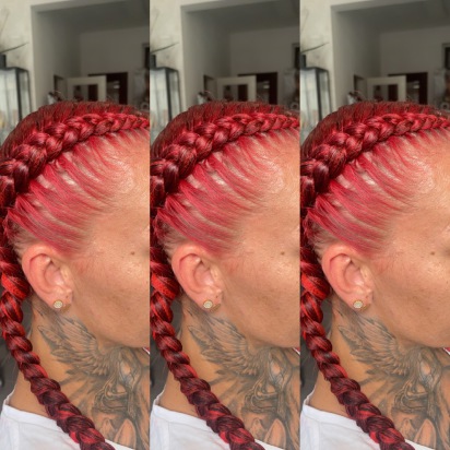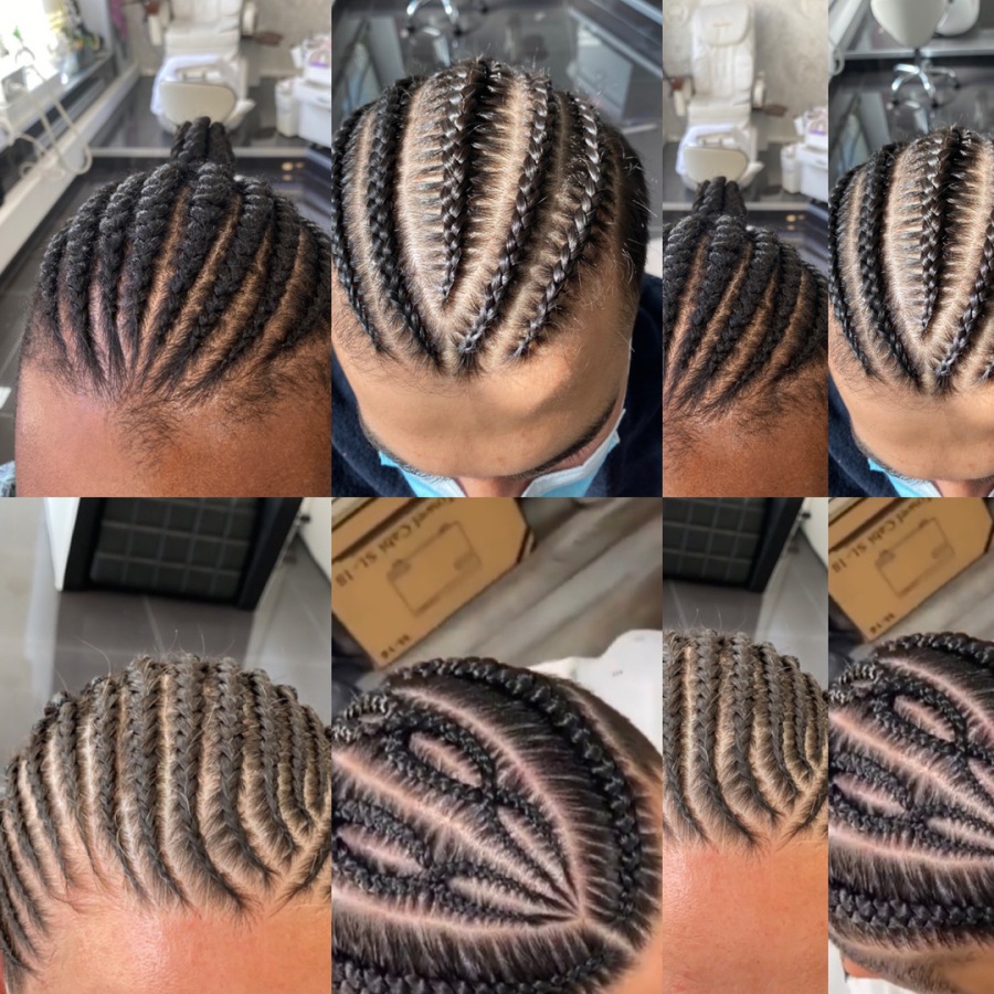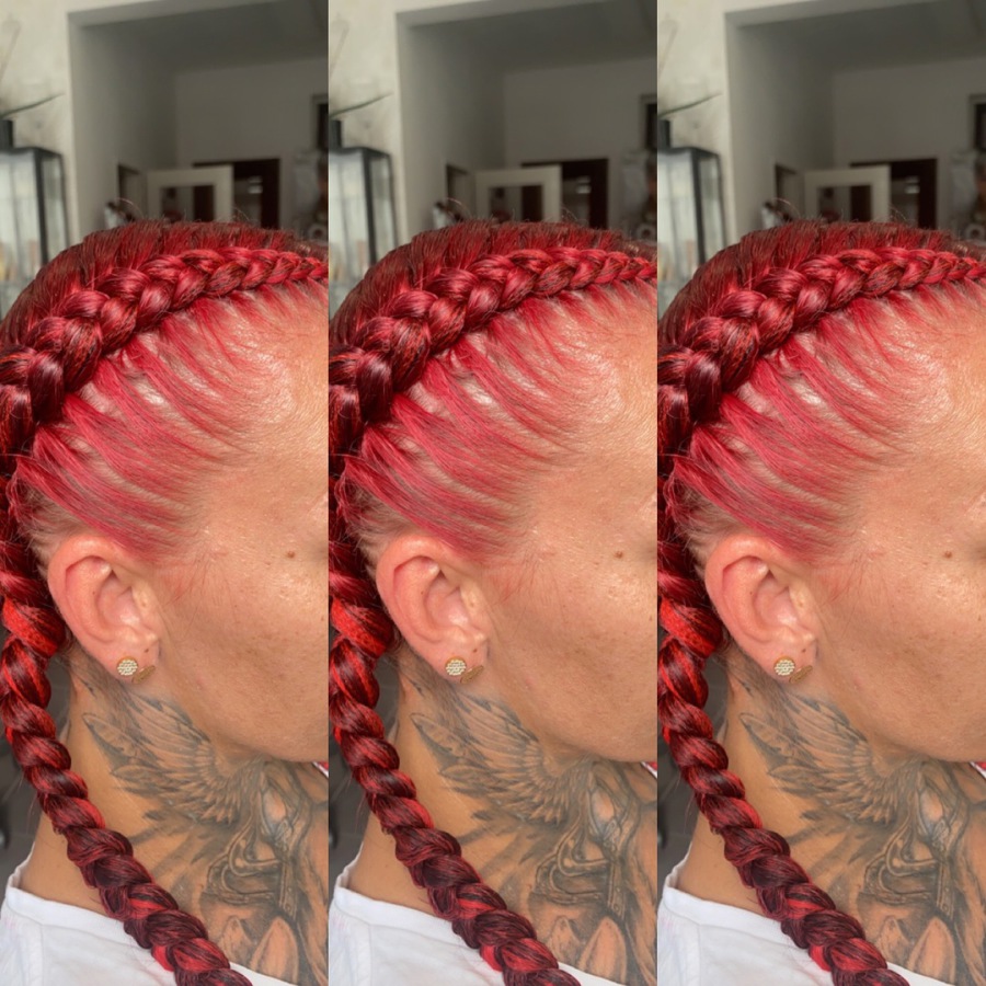 Cornrows mit Extensions sind eine Frisur, bei der das Haar in eng anliegende Zöpfe geflochten wird, ähnlich wie bei klassischen Cornrows. Der Unterschied besteht darin, dass bei Cornrows mit Extensions künstliche Haarverlängerungen oder Kunsthaar verwendet werden, um die Zöpfe zu verlängern oder zusätzliches Volumen zu schaffen. Dies ermöglicht es, die Frisur in verschiedenen Längen und Stilen zu tragen, je nach Vorlieben und gewünschtem Look.