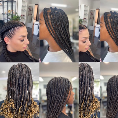 Box Braids sind eine Art von Zopffrisur, bei der das Haar in kleine viereckige oder rechteckige Abschnitte aufgeteilt und dann in einzelne Zöpfe geflochten wird. Diese Zöpfe können unterschiedliche Längen haben und mit Haarverlängerungen oder Kunsthaar verlängert werden. Box Braids sind eine beliebte Frisur, besonders bei Menschen mit afrikanischer oder afroamerikanischer Haartextur, da sie eine schützende Frisur sind, die das natürliche Haar vor Beschädigung durch Styling und Umwelteinflüsse schützen kann. Sie sind auch vielseitig und können in verschiedenen Stilen getragen werden.